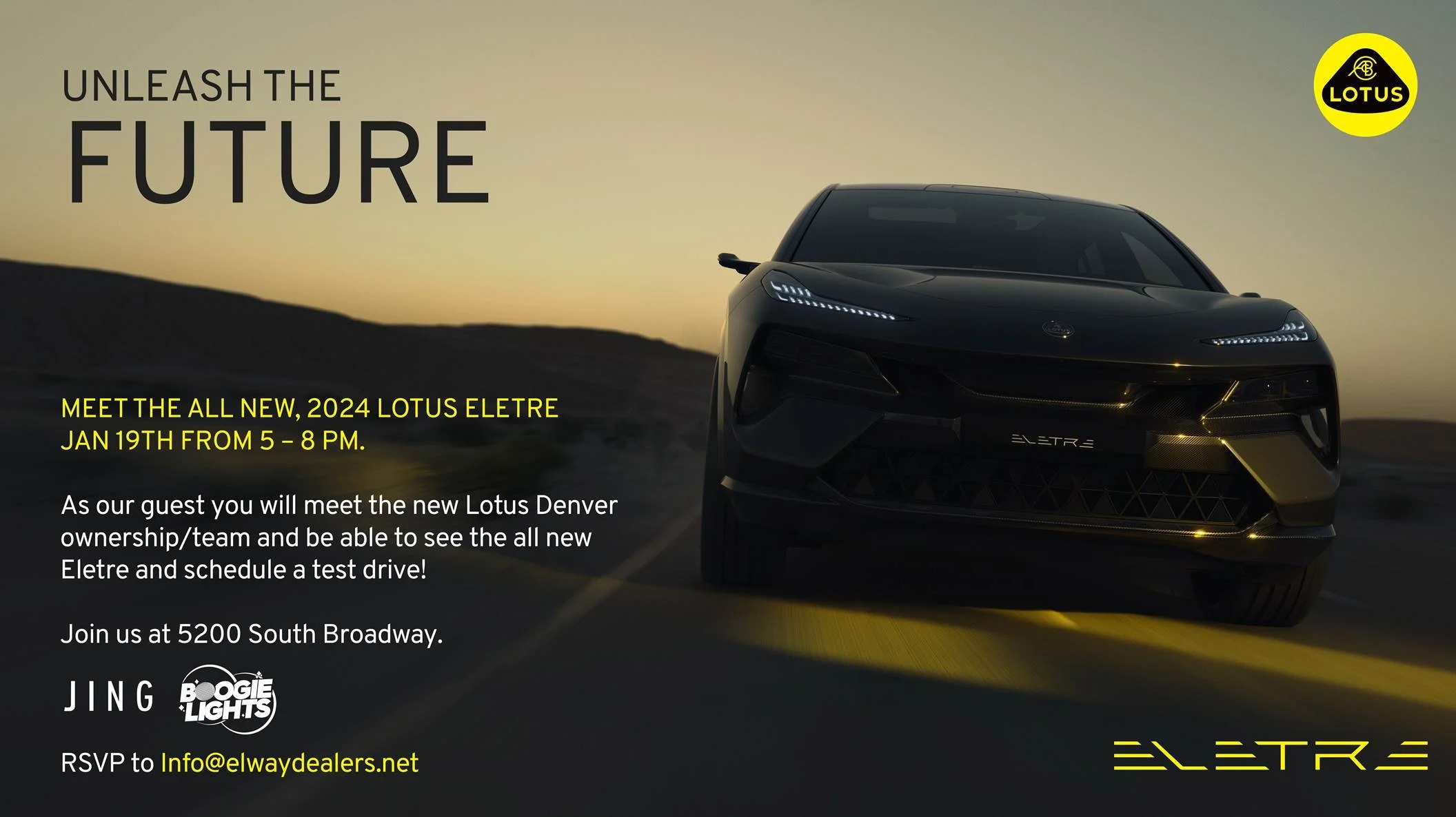 Lotus of Denver invites the club to attend the unveiling of the new Lotus Eletre!